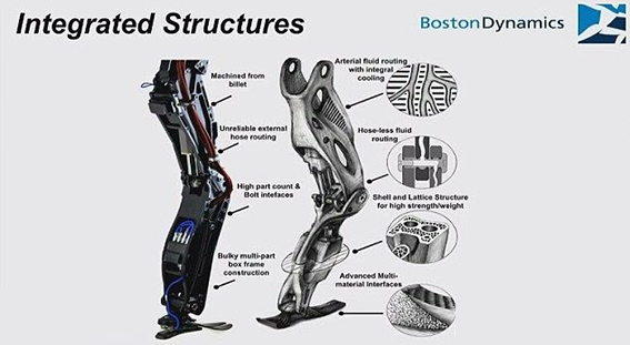 在左边是Atlas腿的一个版本。右边则是波士顿动力“未来的愿景”:这只脚将采用3D 打印,将所有的液压元件直接打印到其结构中。这只脚看上去有很多仿生的元素,比如“类动脉式的液压管道布局”、看上去很像骨头的支架等。我们并没有看到这条腿的实物图片,但听上去波士顿动力已经造出来了一个。Marc Raibert信心满满的说:「我现在还不能给你们展示机器人,但我们在很努力地推进这个项目,并且我认为到年底你们将看到使用类似这种技术制作的波士顿动力机器人。」虽然推迟了几个月,但Atlas还是做到了。